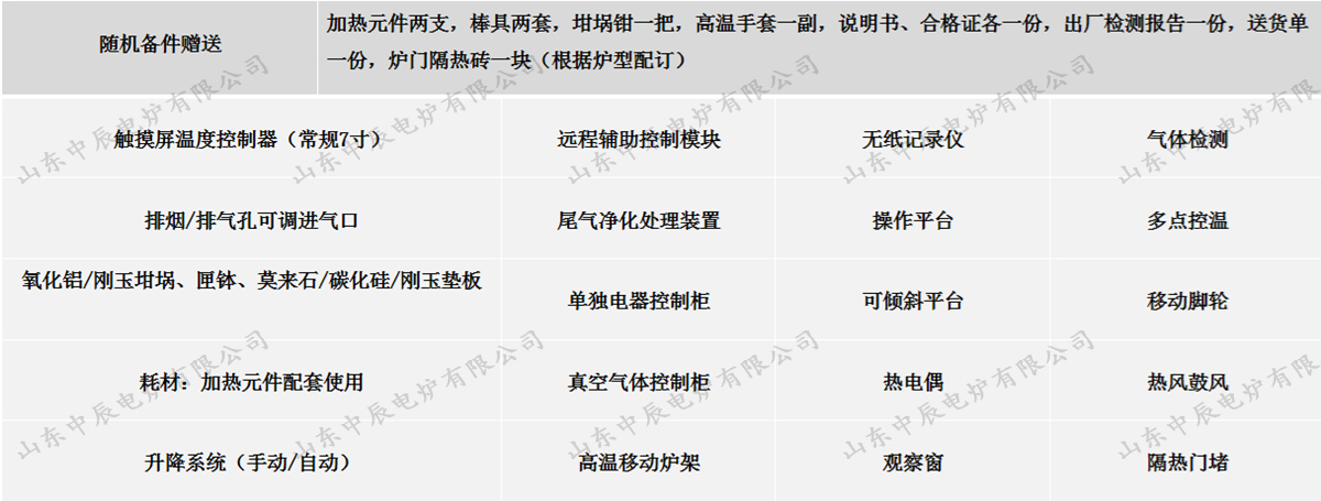 加热元件两支,棒具两套,坩埚钳一把,高温手套一副,说明书、合格证各一份,出厂检测报告一份,送货单一份,炉门隔热砖一块(根据炉型配订) | |||||