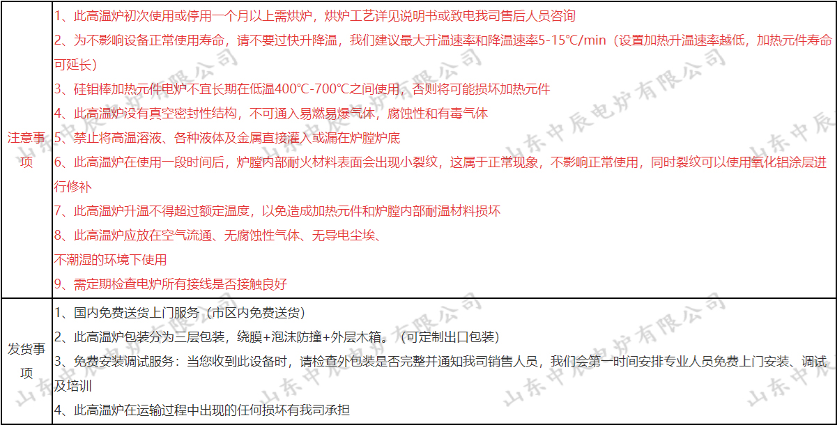 加热元件两支,棒具两套,坩埚钳一把,高温手套一副,说明书、合格证各一份,出厂检测报告一份,送货单一份,炉门隔热砖一块(根据炉型配订) | |||||
